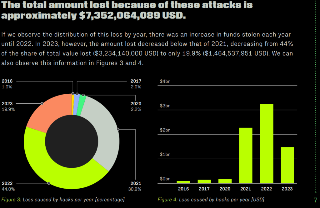 De top 100 grootste DeFi-hacks vertegenwoordigen inmiddels meer dan $7 miljard aan gestolen digitale activa. Hoewel het aantal aanvallen in 2023 licht daalde, stijgt de totale waarde die in 2024 door hackers wordt gestolen naar verwachting. Dit komt doordat DeFi-platforms steeds meer waarde opslaan, waardoor ze een aantrekkelijk doelwit zijn voor cybercriminelen.